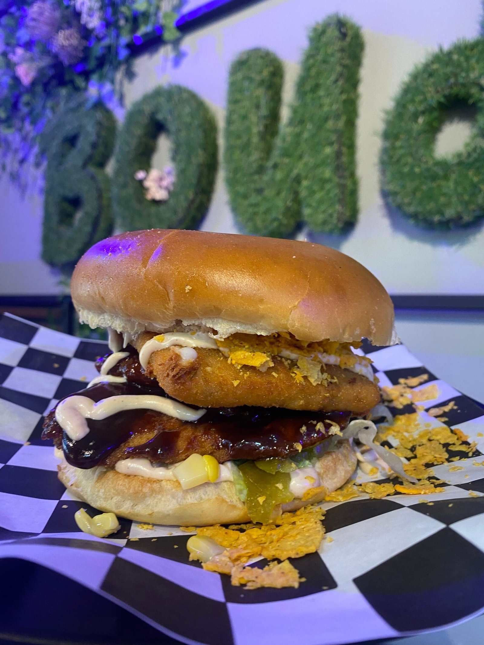 صوص, خس, بصل, بندورة, ذرة, صدر دجاج مشوي, صدر دجاج مقلى. تشدر, موزيريلا. باربكيو صوص, صوص برينز